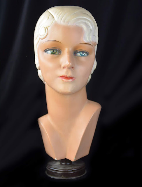 This mannequin head has never been on the market before.  It was originally a gift to a milliner who worked at an exclusive hat shop in a Midwestern department store near Detroit and then handed down to her friend who later became an antiques dealer. The mannequin was used in a display case for several decades when it finally returned to the owner's home, where it was acquired for my personal collection for use in an upcoming book.